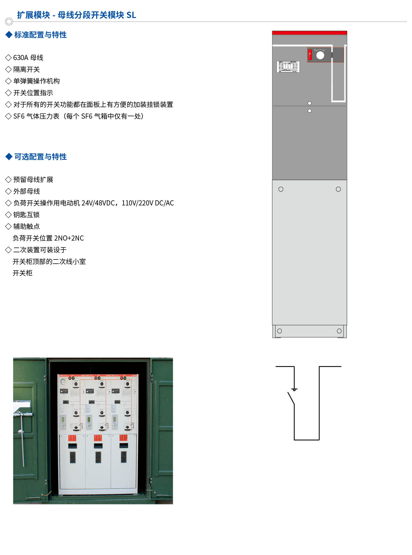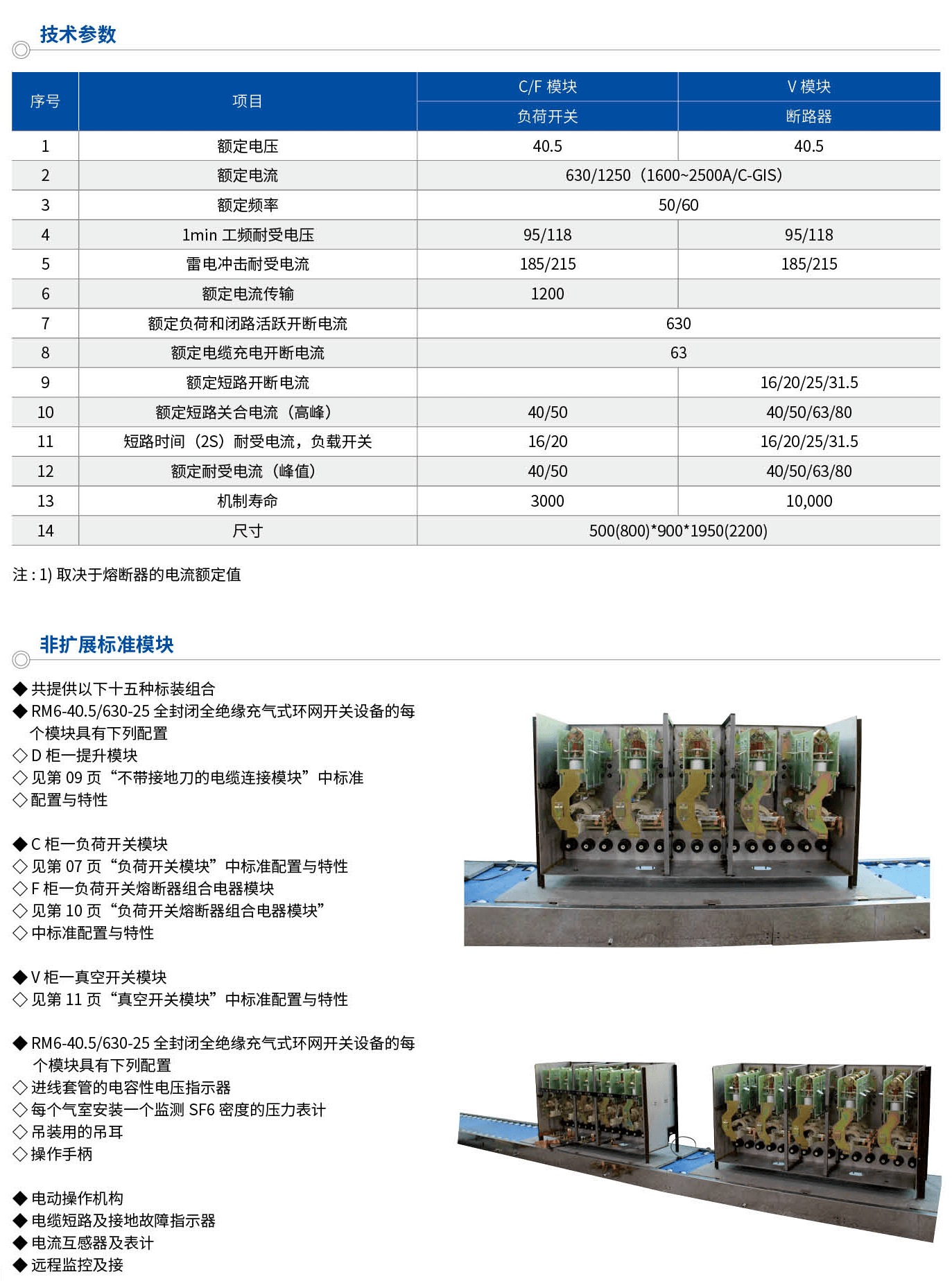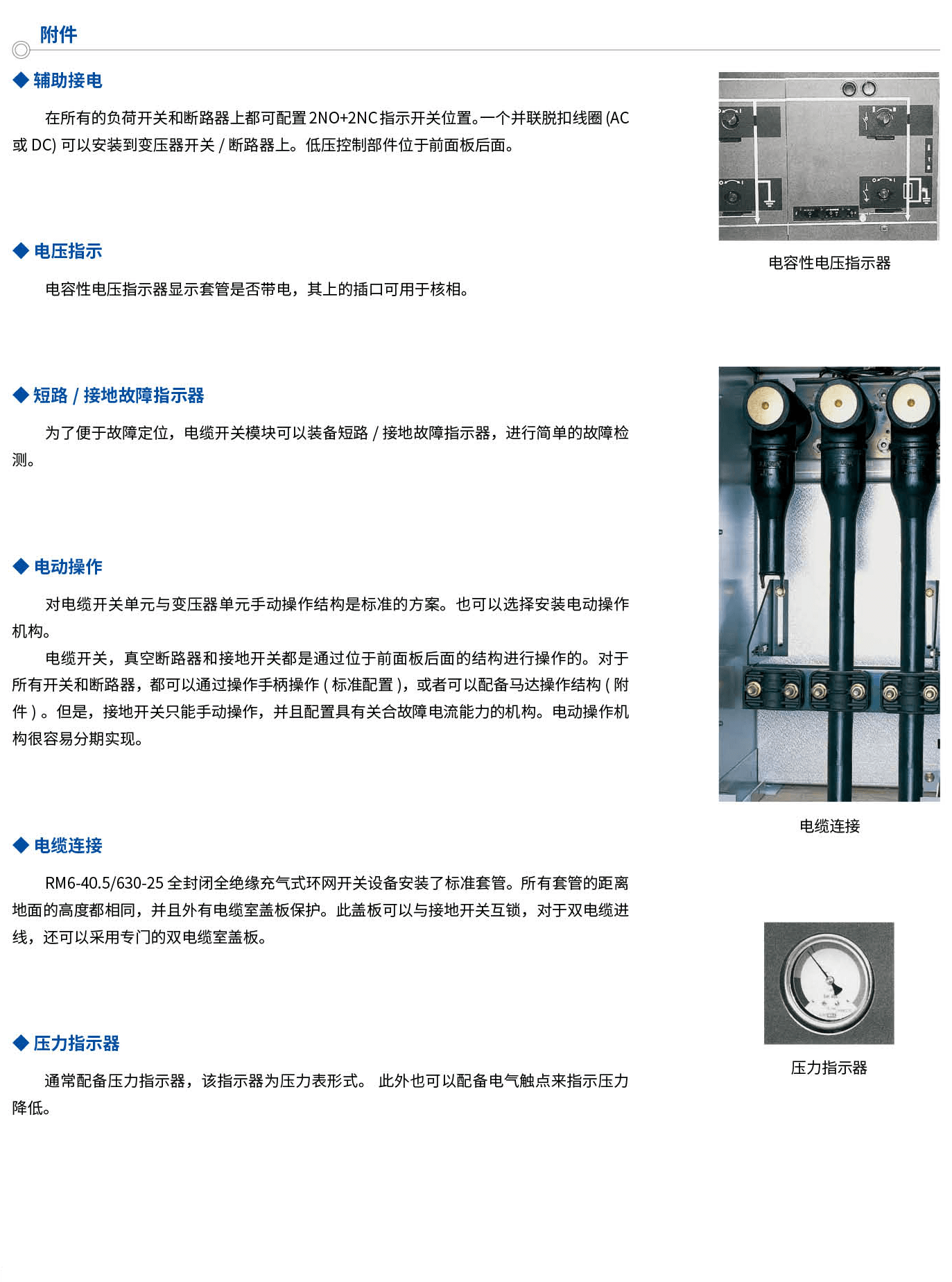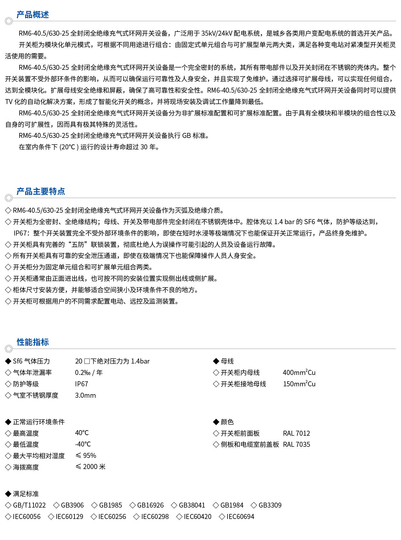 RM6-40.5/630-25全封闭全绝缘充气式环网开关设备,广泛用于35kV/24kV配电系统,是城乡各类用户变配电系统的首选开关产品。开关柜为模块化单元模式,可根据不同用途进行组合:由固定式单元组合与可扩展型单元两大类,满足各种变电站对紧凑型开关柜灵活使用的需要。RM6-40.5/630-25全封闭全绝缘充气式环网开关设备是一个完全密封的系统,其所有带电部件以及开关封闭在不锈钢的壳体内。整个开关装置不受外部环条件的影响,从而可以确保运行可靠性及人身安全,并且实现了免维护。通过选择可扩展母线,可以实现任何组合,达到全模块化。扩展母线安全绝缘和屏蔽,确保了高可靠性和安全性。RM6-40.5/630-25全封闭全绝缘充气式环网开关设备同时可以提供TV化的自动化解决方案,形成了智能化开关的概念,并将现场安装及调试工作量降到最低。RM6-40.5/630-25全封闭全绝缘充气式环网开关设备分为非扩展标准配置和可扩展标准配置。由于具有全模块和半模块的组合性以及自身的可扩展性,因而具有极其特殊的灵活性。RM6-40.5/630-25全封闭全绝缘充气式环网开关设备执行GB标准。在室内条件下(20℃)运行的设计寿命超过30年。